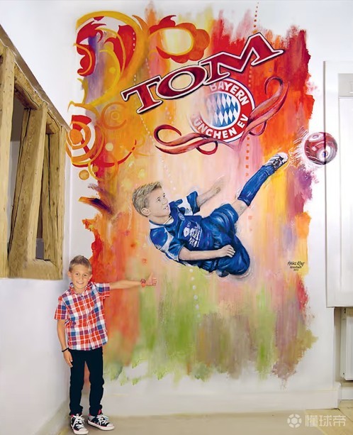 我小时候啊,多年都睡在一个有拜仁队徽的大画像下面,那画可大了,估计得有三米高,两米半宽。我刚上学那会儿就收到了这份礼物,我爸爸可是拜仁的铁杆粉丝,他请了个画家朋友来我卧室画了这幅画:我穿着阿莫巴赫(我家乡的球队)的球衣,做着倒勾射门的动作,而我头顶上,用巨大的字画着拜仁的队徽。我爸爸很早就让我加入了球迷俱乐部。我不知多少次在拜仁队徽下睡着又醒来。我肯定有30件拜仁的球衣呢。